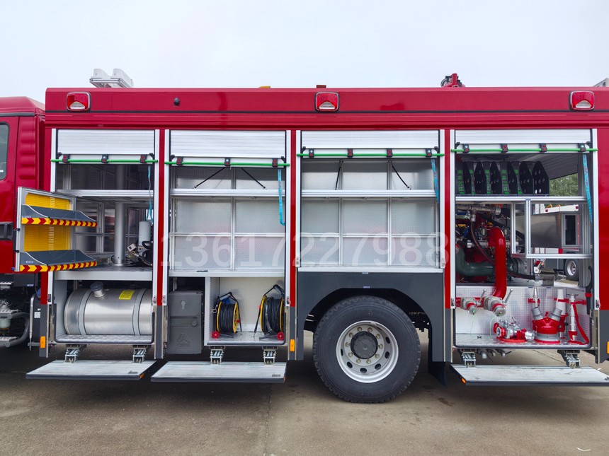 汕德卡壓縮空氣泡沫消防車采用中國重汽集團濟南商用車有限公司生產的汕德卡ZZ5206N471GF5(國六)消防車底盤改裝而成。整車由消防員乘員室和車身兩大部分組成,乘員室為原裝雙排駕駛室,可乘坐2+4人,該車為內藏罐結構,車身前部為器材箱,中部為水罐,水罐兩側為器材箱,后部為泵房。載液罐體為304不銹鋼,與底盤采用彈性連接,載水4500L,泡沫液量1000 L(A,B類各500L),裝備了茸申CB10/60-RS消防泵,德川模塊式DC-CAFS60/45M壓縮空氣泡沫滅火系統,廣泛應用于地下、石油、化工、大型商場、高層住宅、重點文物、車站碼頭等。特別節省水和泡沫液,高效環保,而且不會造成二次傷害。