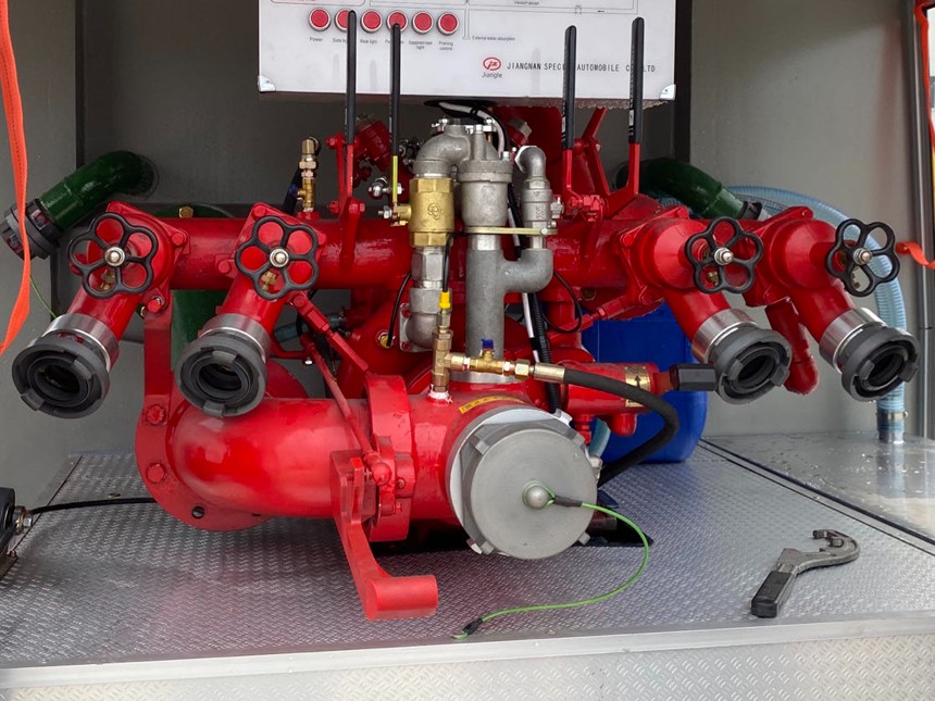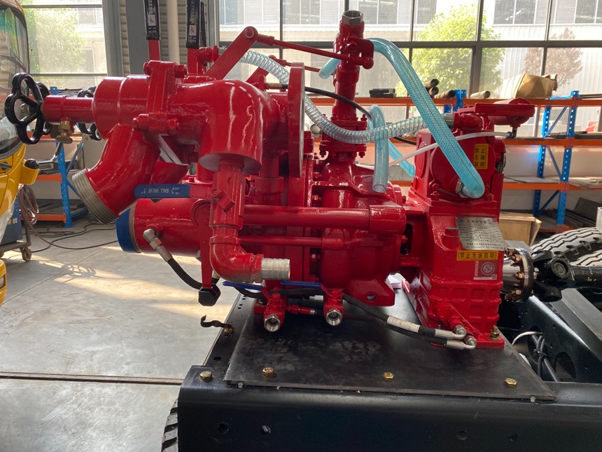 30高低壓消防泵由高、低壓離心泵級組、活塞真空泵、電磁離合器自動分離裝置、增速箱、進水管組、高、低壓出水口帶止回閥組等組成,高低壓離心泵由高低壓泵殼體、泵軸、葉輪、機械密封等組成。活塞式真空泵由泵體、雙活塞、泵軸、電磁離合器等組成。增速器由一對斜齒輪、增速箱體、齒輪軸、單列向心球軸承、連軸法蘭等組成。車用消防泵的關健件經合理選材,標準件嚴格選用。高、低壓離心泵級組由泵蓋、高壓泵殼、低壓泵殼、高壓葉輪、低壓葉輪、泵軸、機械密封等組成。該泵起到提供壓力≥4.0MPa、流量≥6L/s和壓力≥1.0MPa、流量≥30L/s的二種功能壓力水源,同時也能實現高低壓聯用功能。